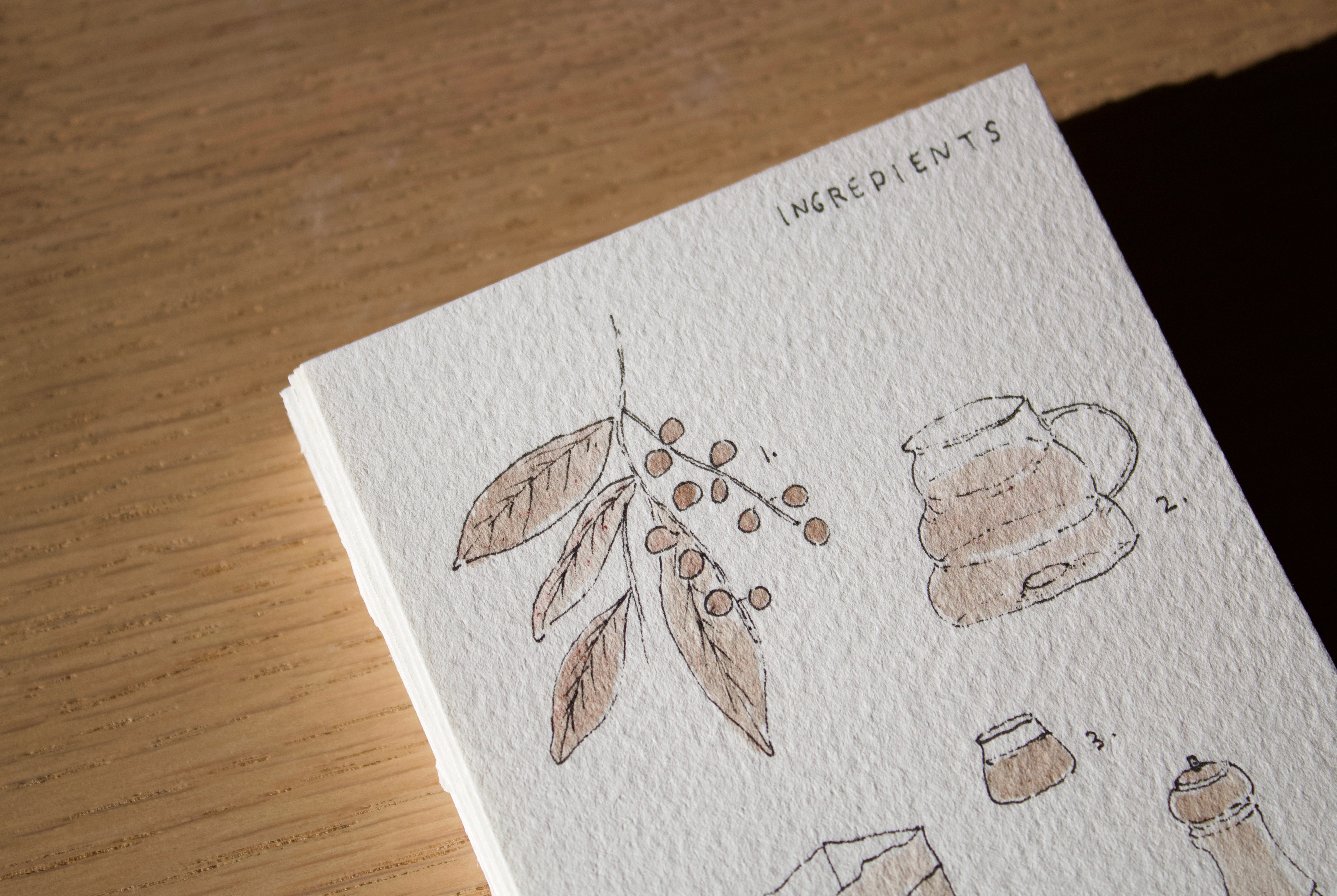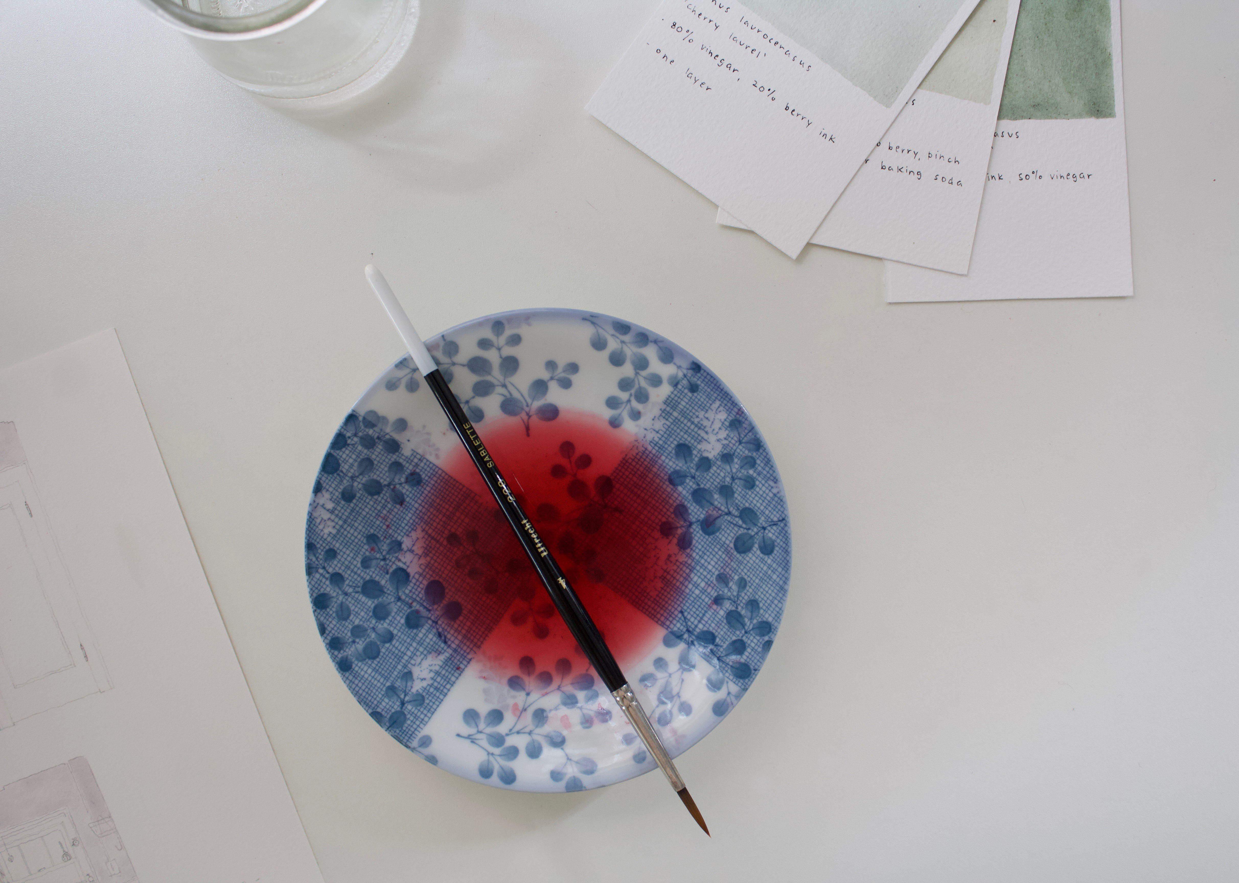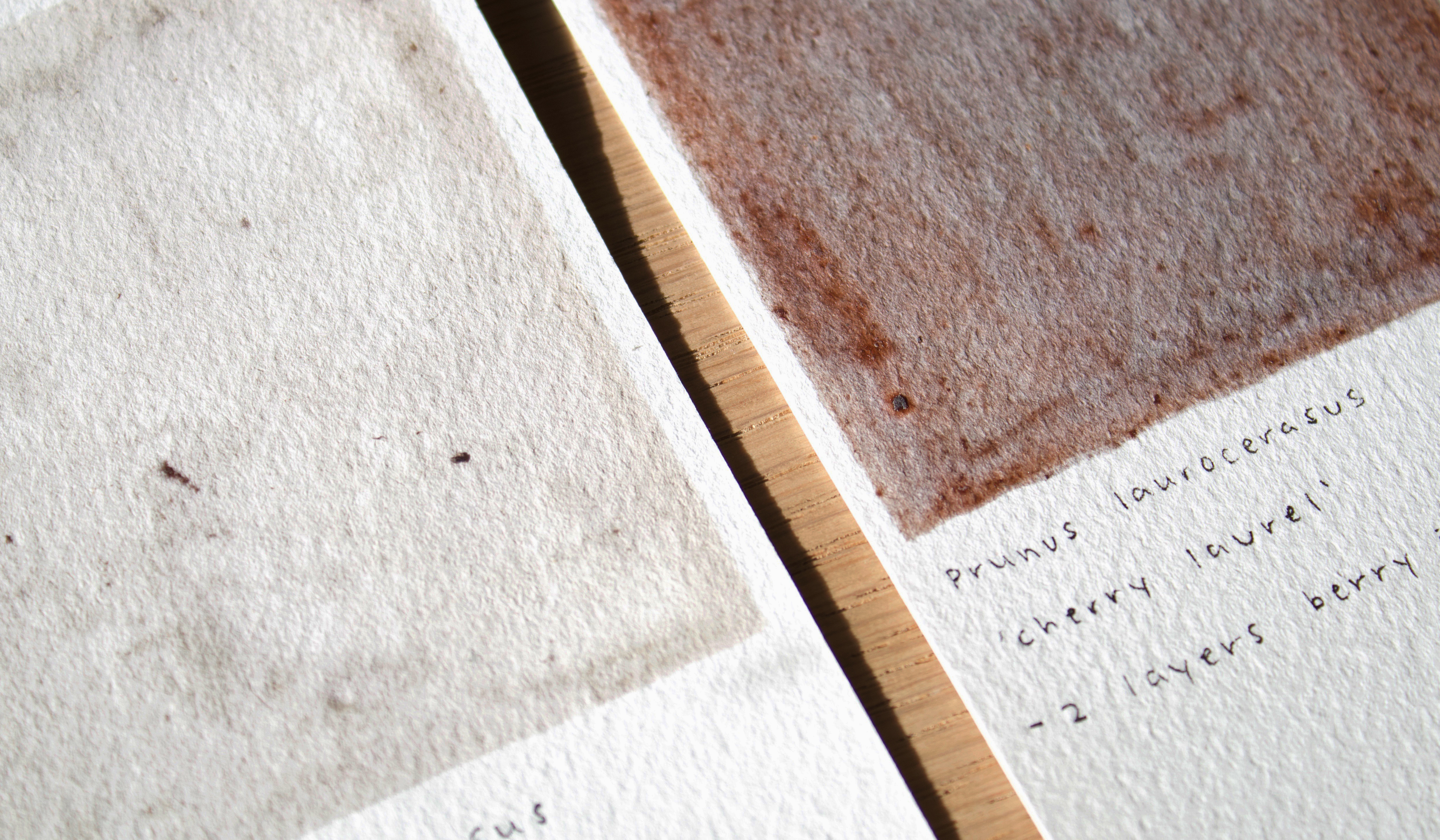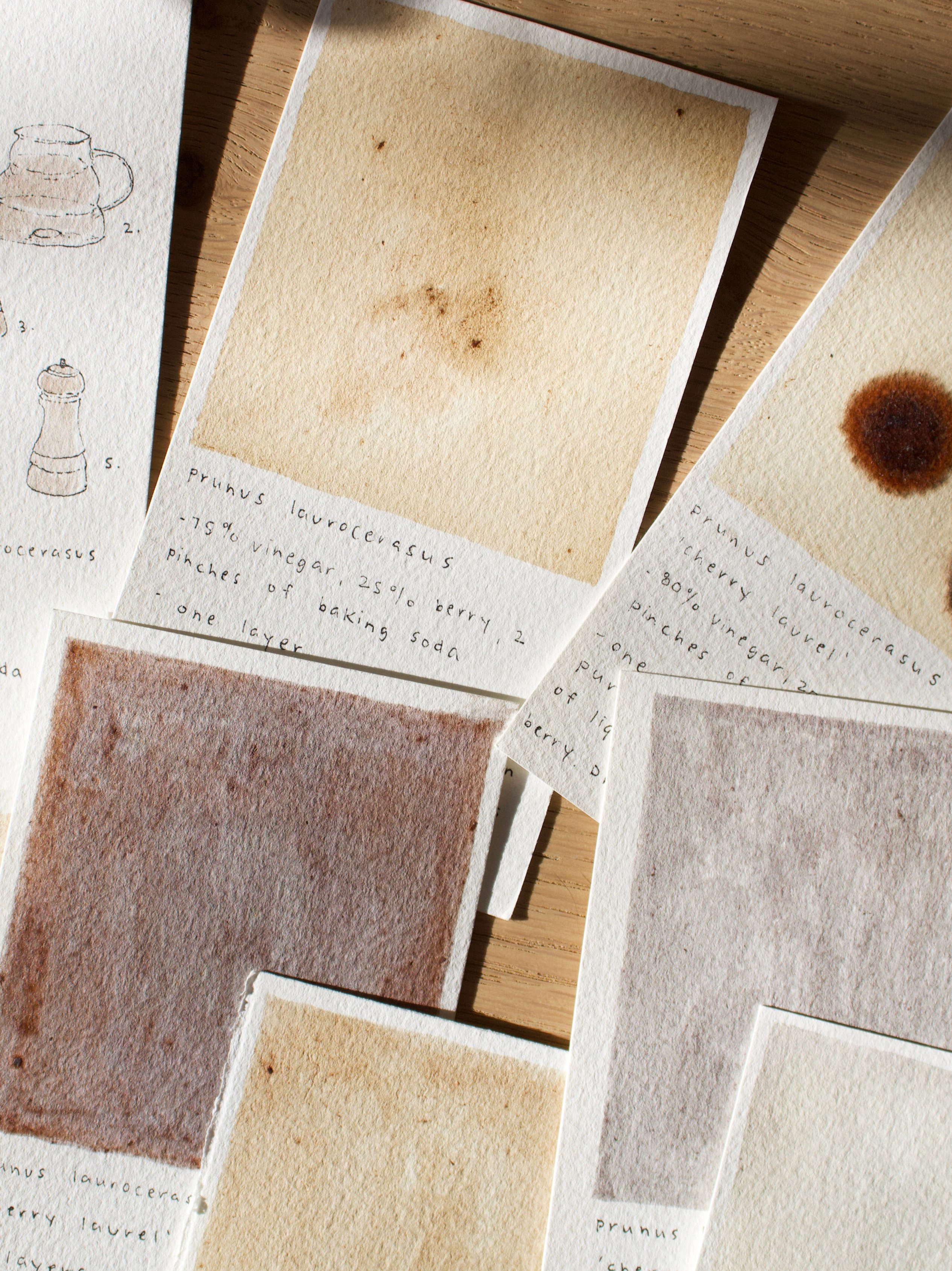 Collected cherry laurel berries were boiled down and mixed with solvents at various ratios creating 14 different ink samples. The inks were painted on paper and revealed colors ranging from deep purples to shades of jade. A year later, the colors have transformed to warm sepias and pale pigeon grays.