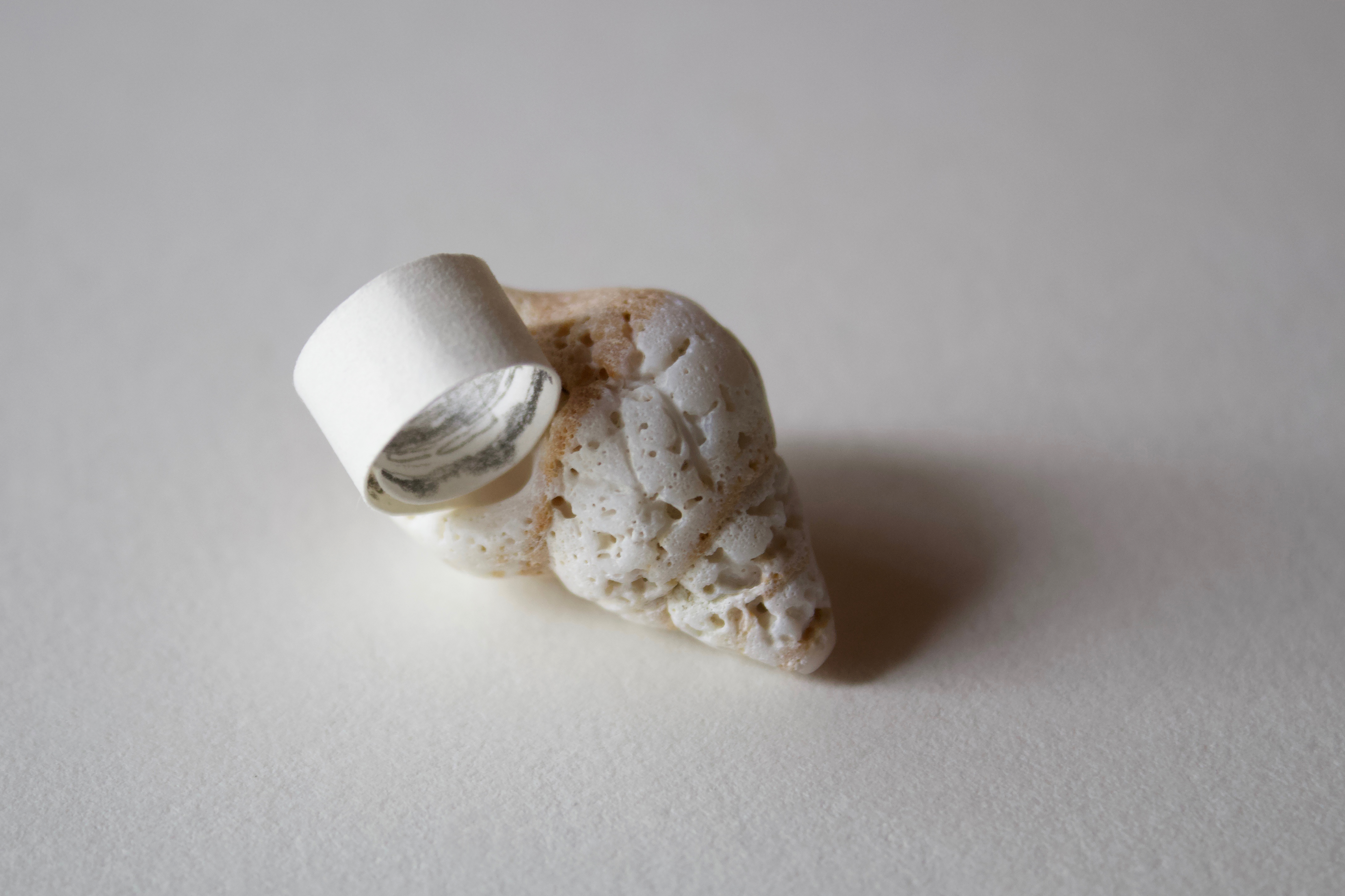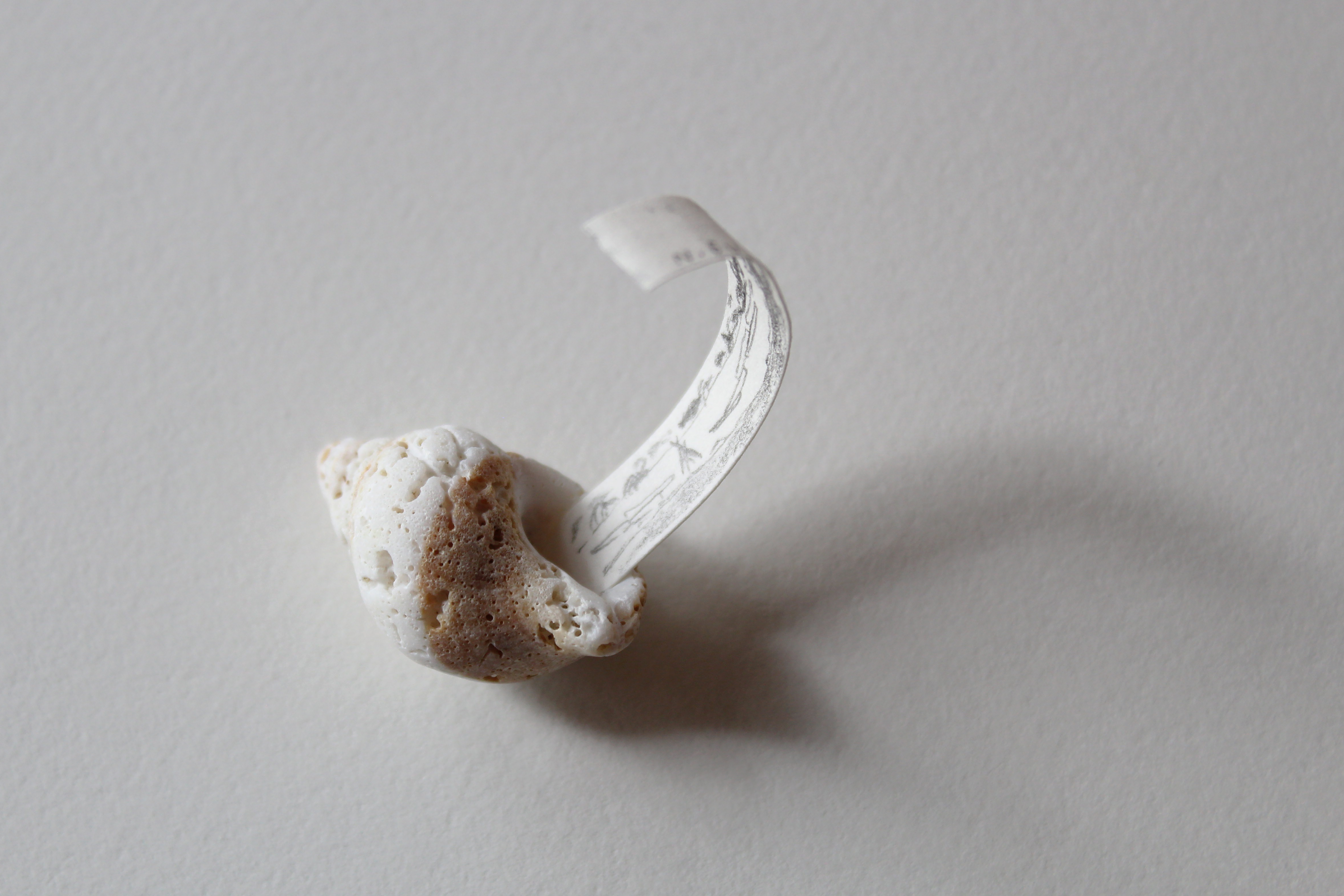 Experimenting with foraged shells, the Buccinum undatum lends itself to a different format of storytelling. Unlike the disc-like shape of the L. scutum shells, the B. undatum shell becomes a house for a miniature scroll to slide into. Illustrated is a scene from Lincoln Park, where the shell was collected from.