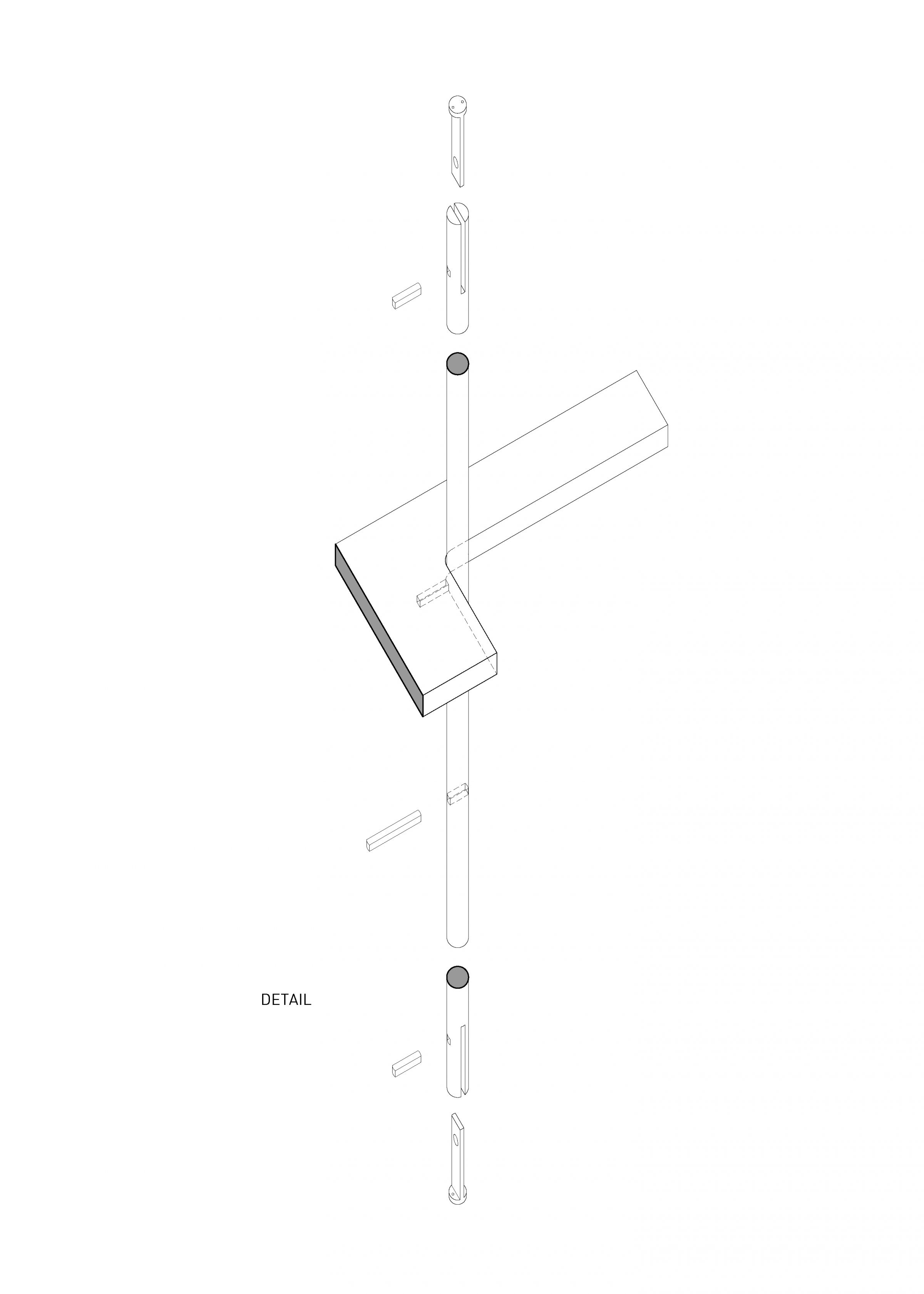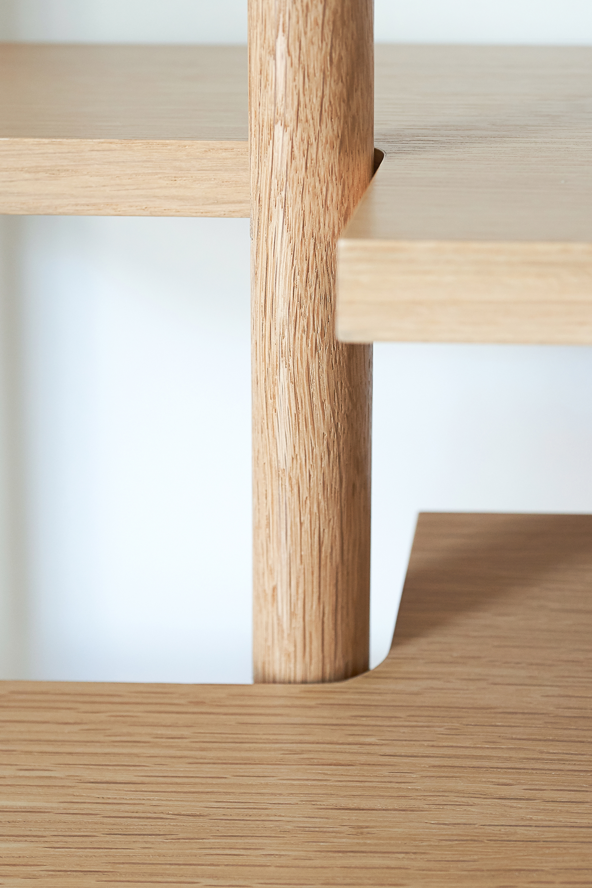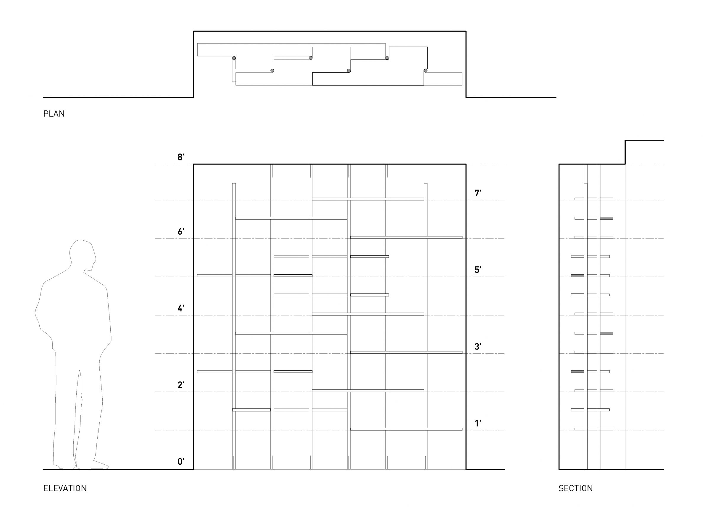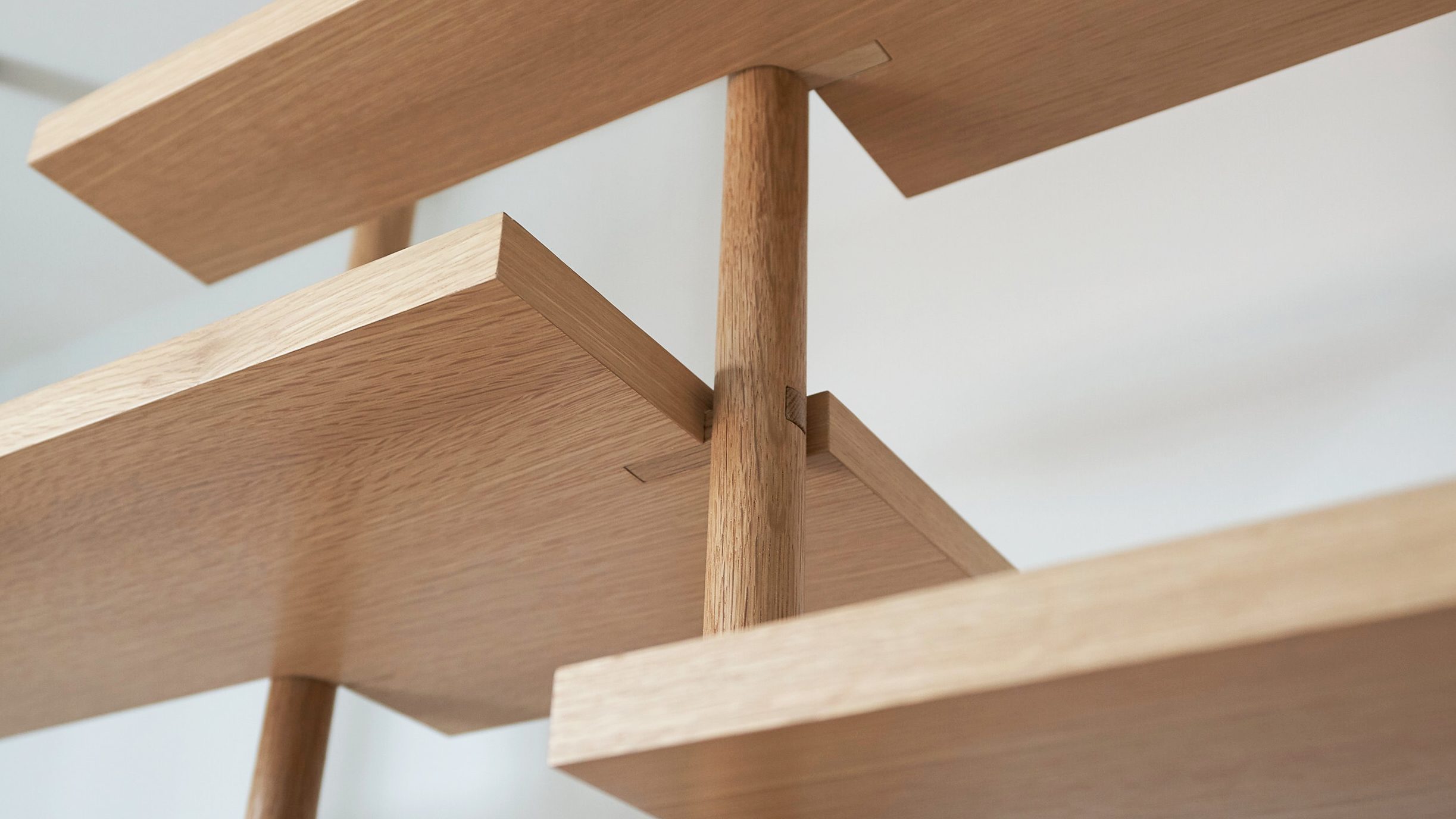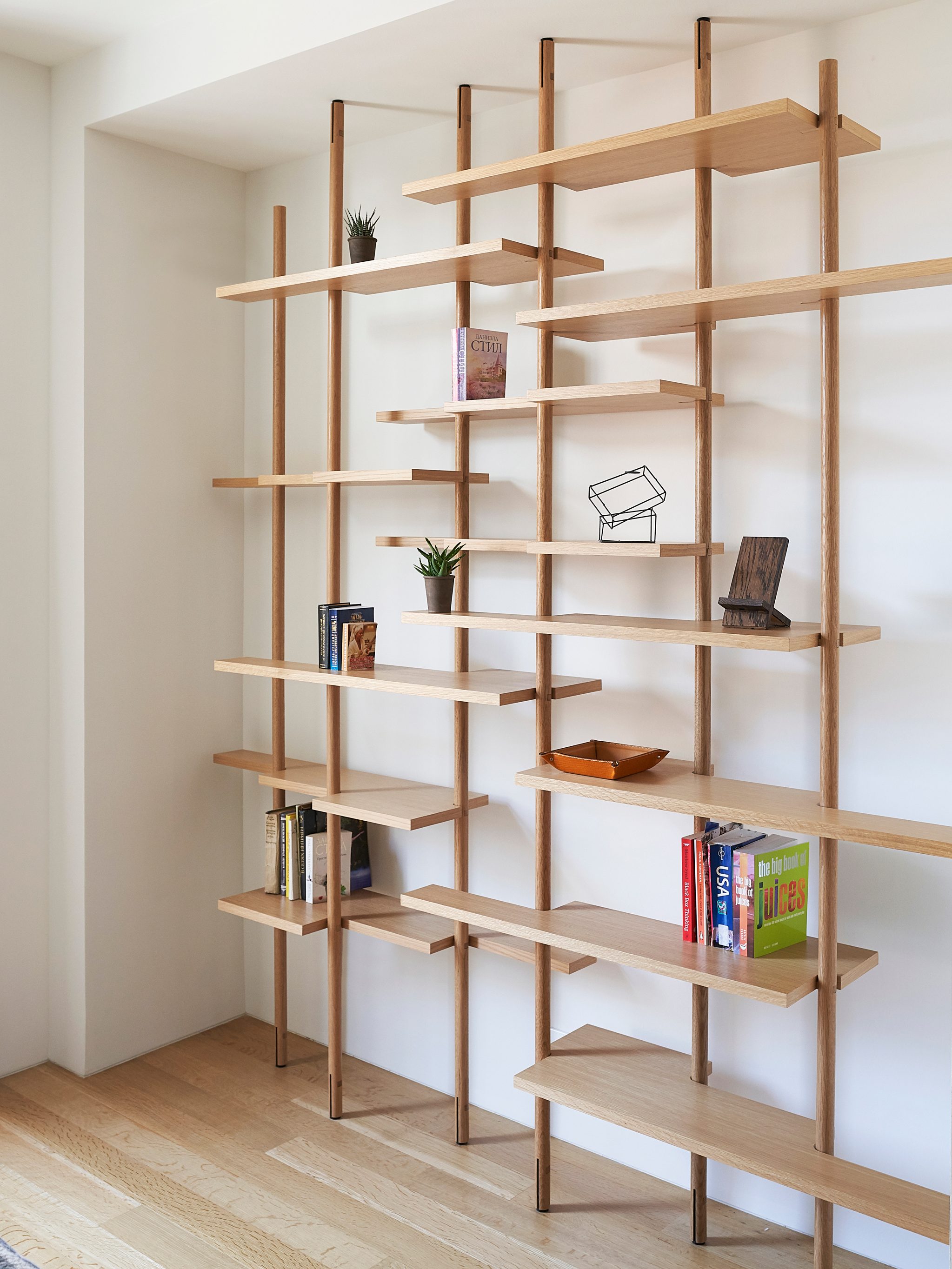 Solid white oak dowels slot into custom metal connections at the ground and ceiling. Like trunks in a forest, the dowels stagger as they march from left to right. Responding to the articulation of vertical elements, the shelves step at each connection point where a square pin is inserted between shelf and post.