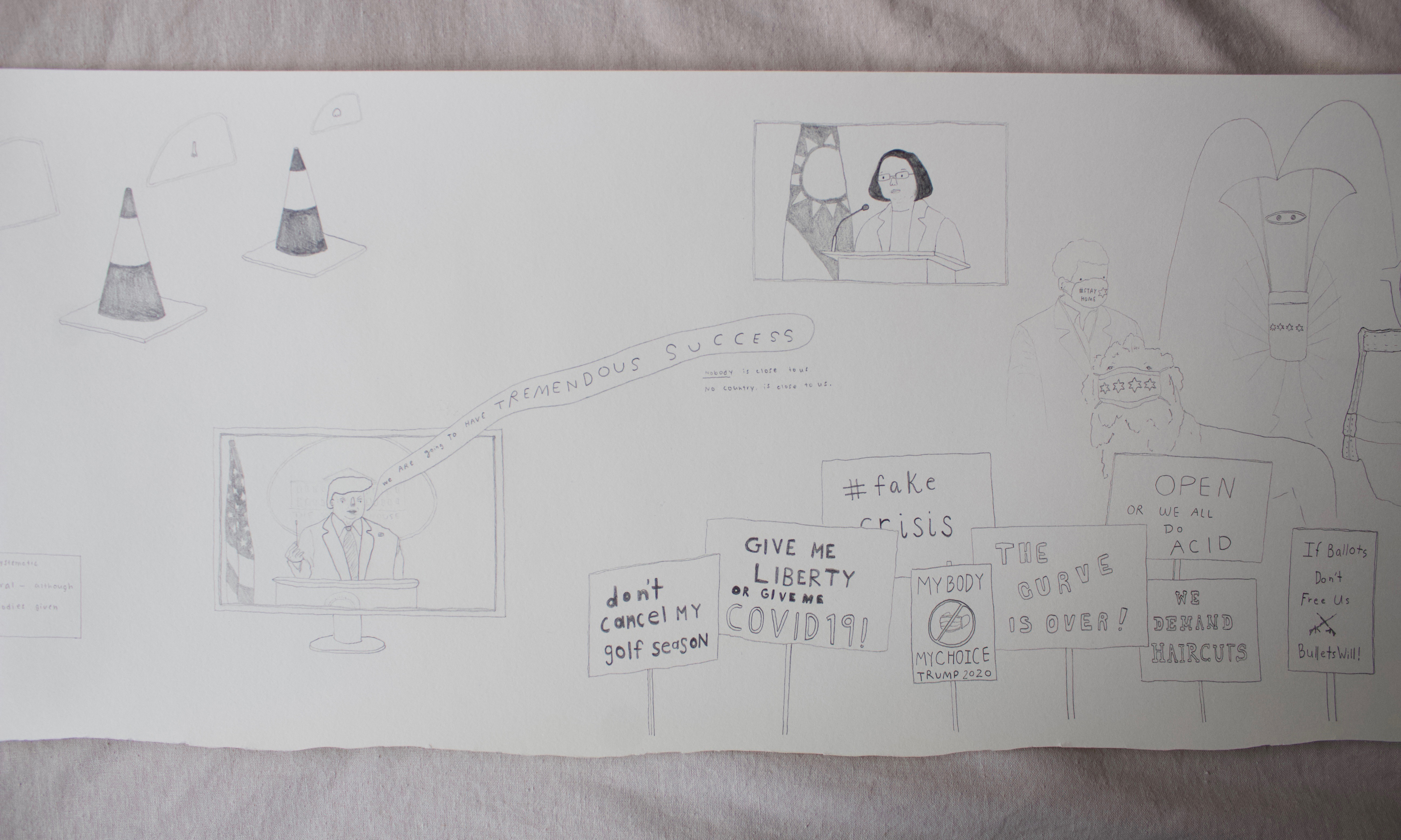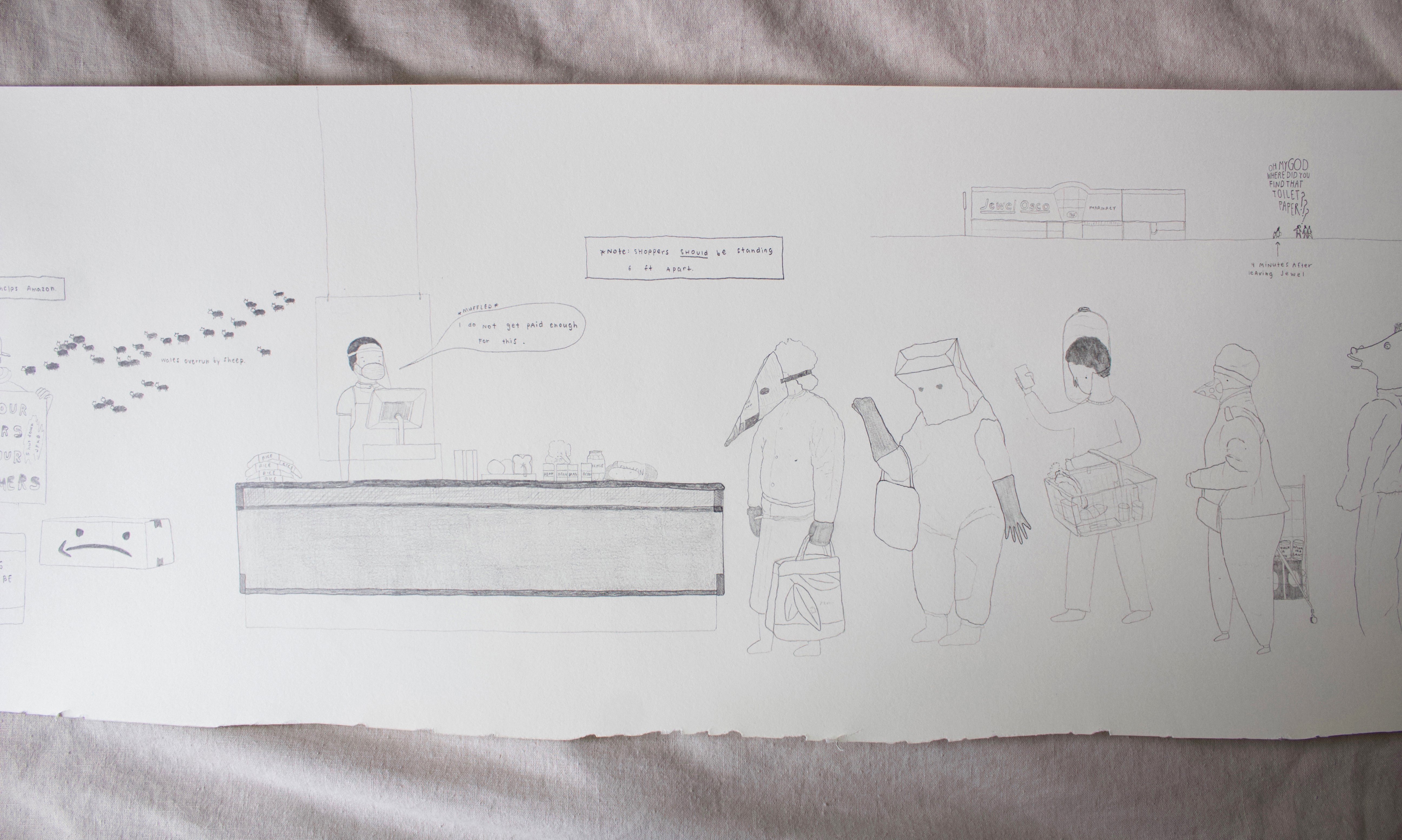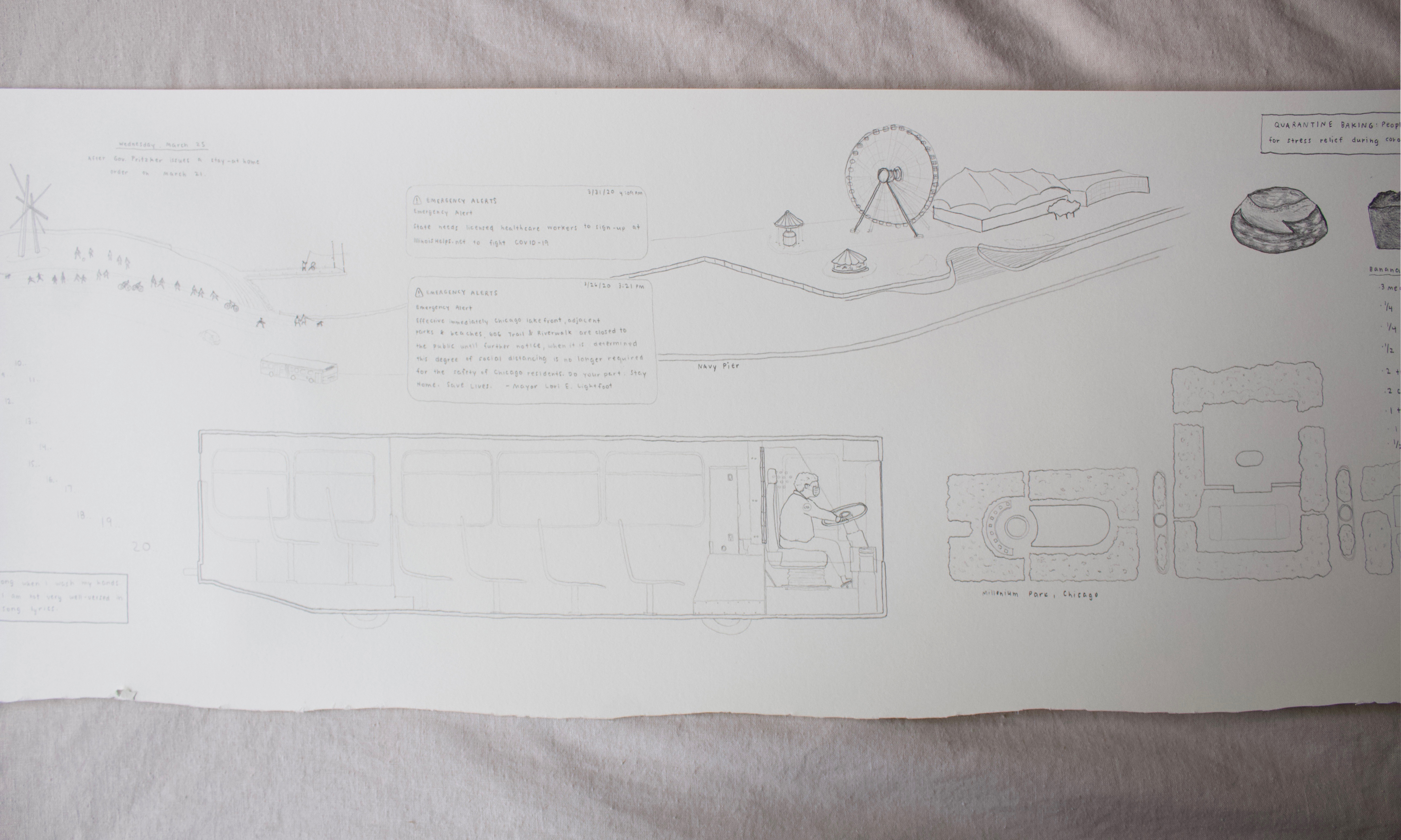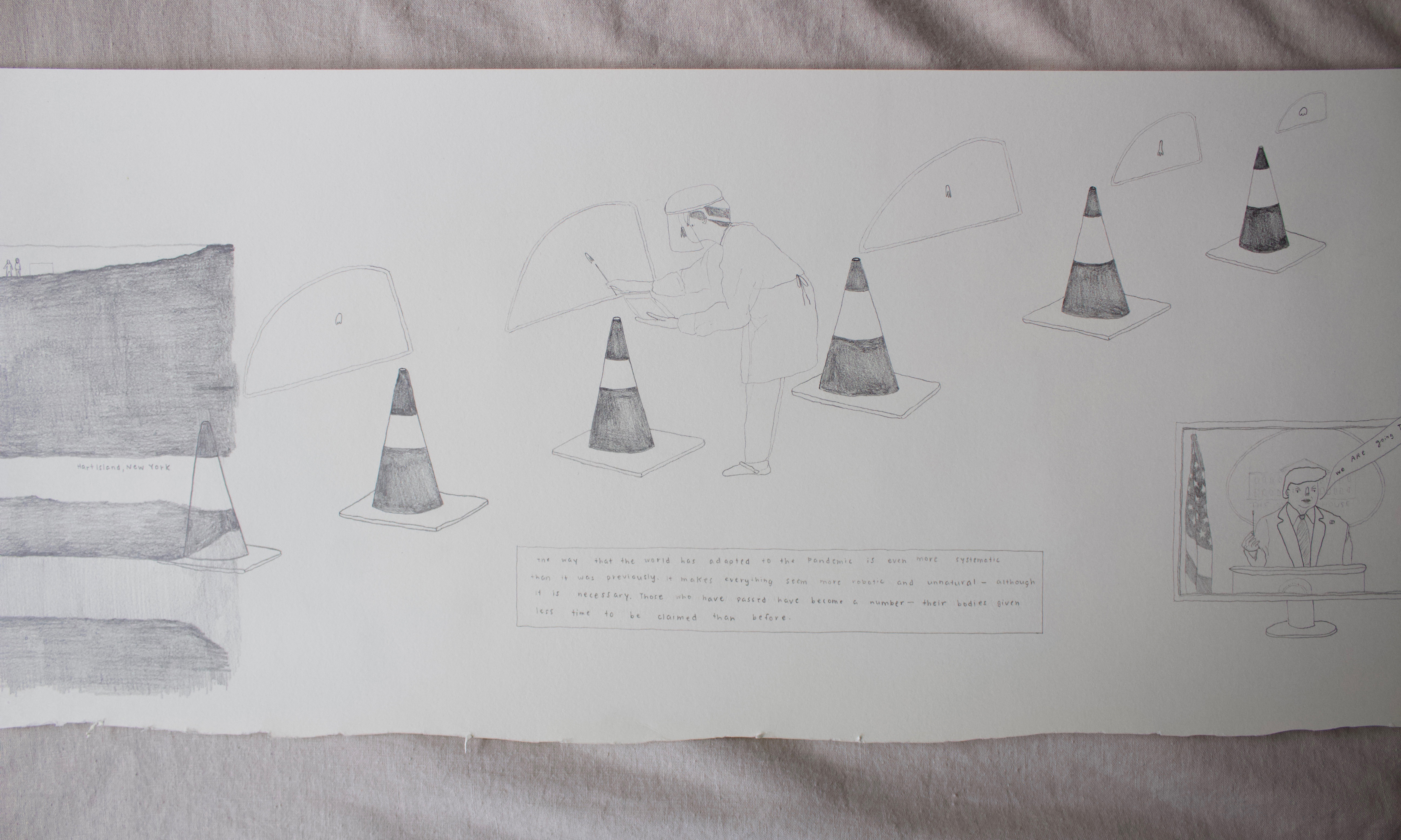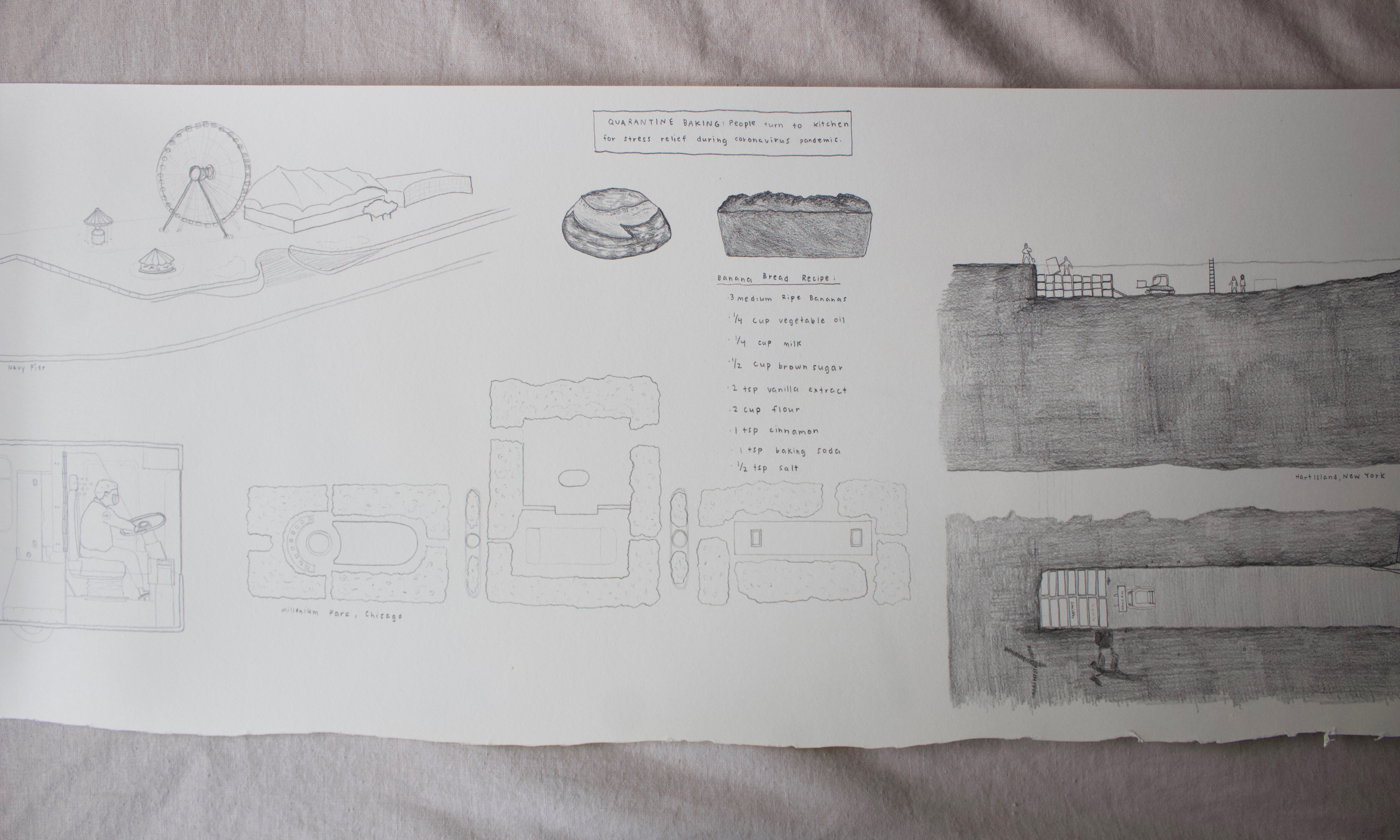 Started in lockdown, this thirty foot scroll illustrates the different ways the Covid-19 pandemic globally impacted the daily routines of life. With an emphasis on spatial organization, the two-year recording shares both anecdotal observations and news from online sources while in isolation.