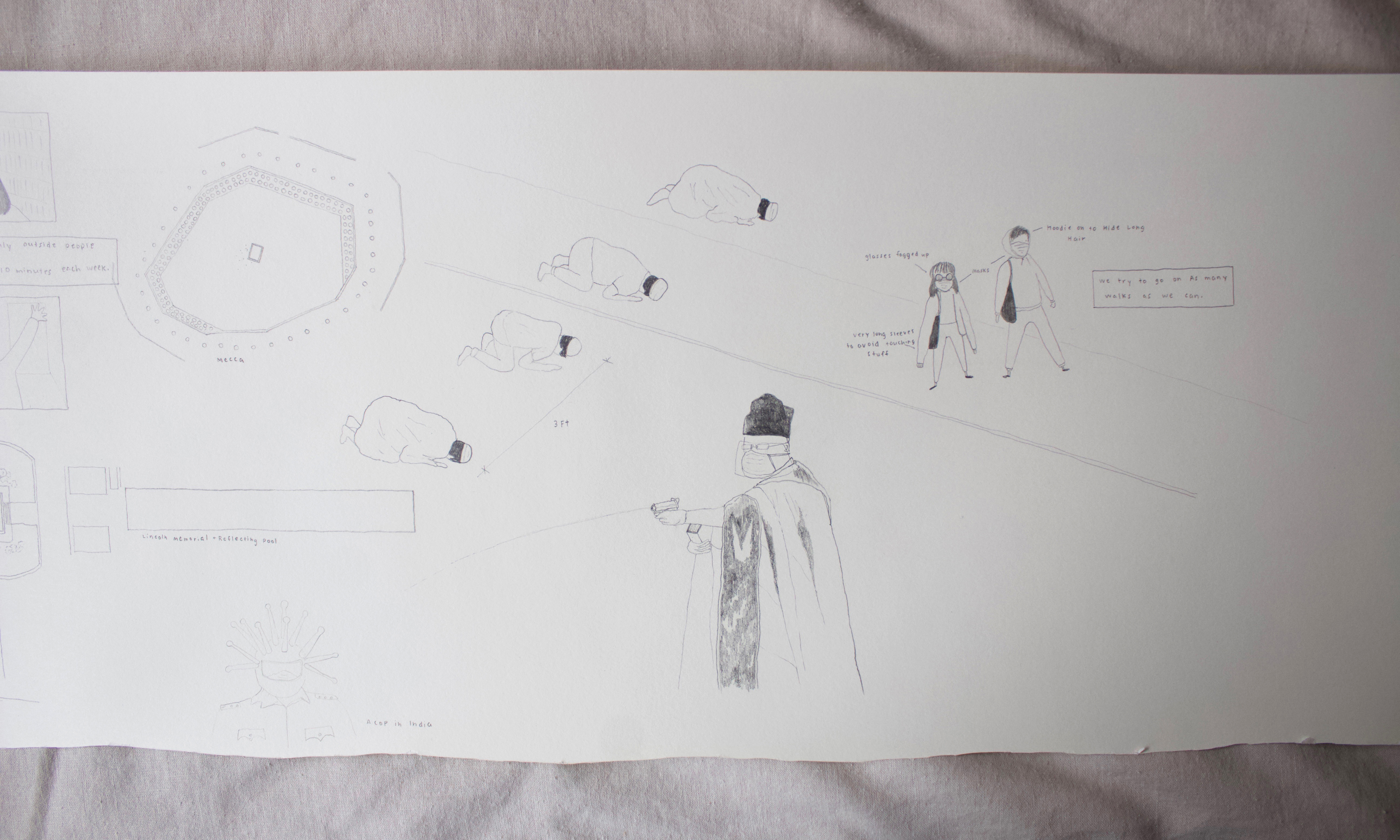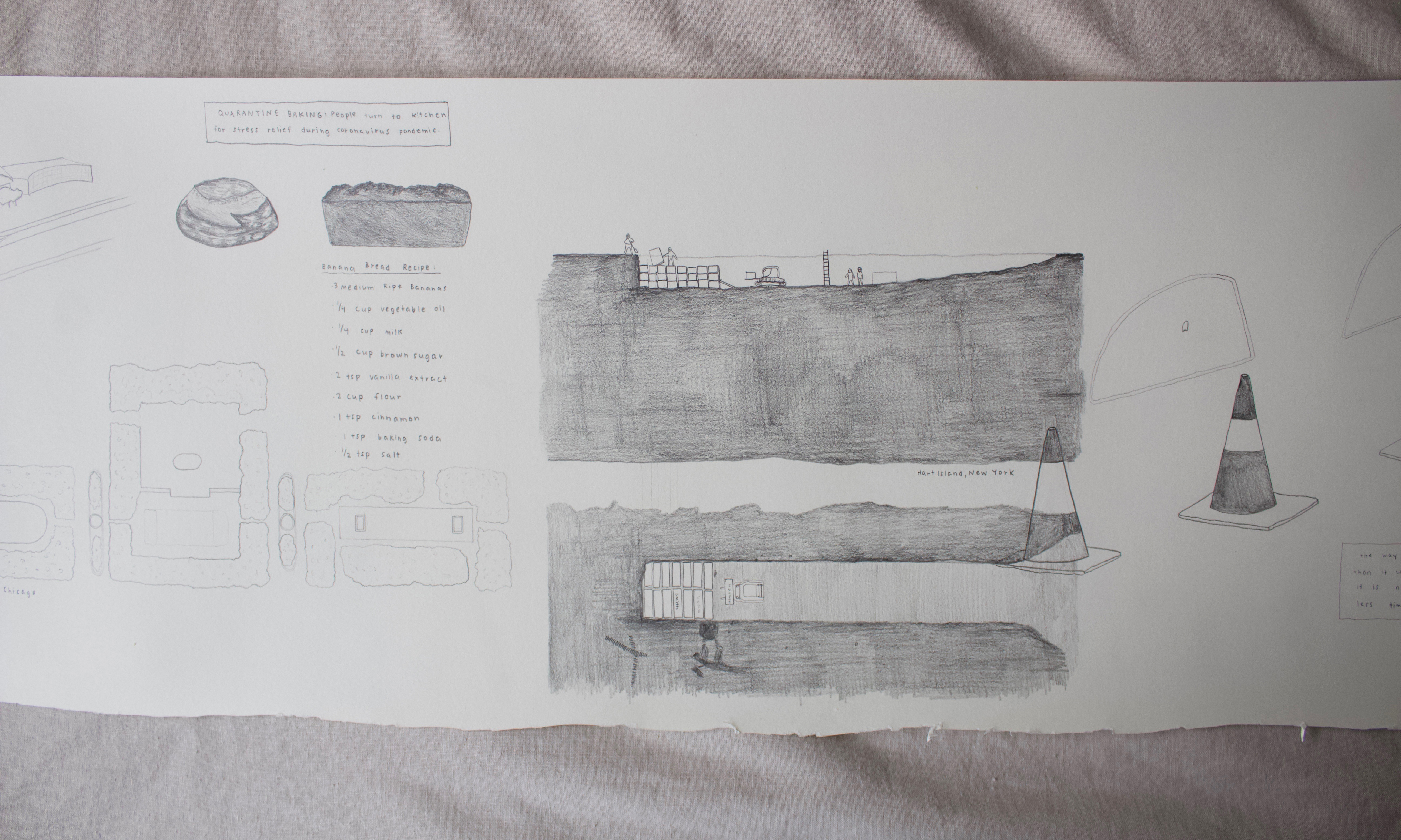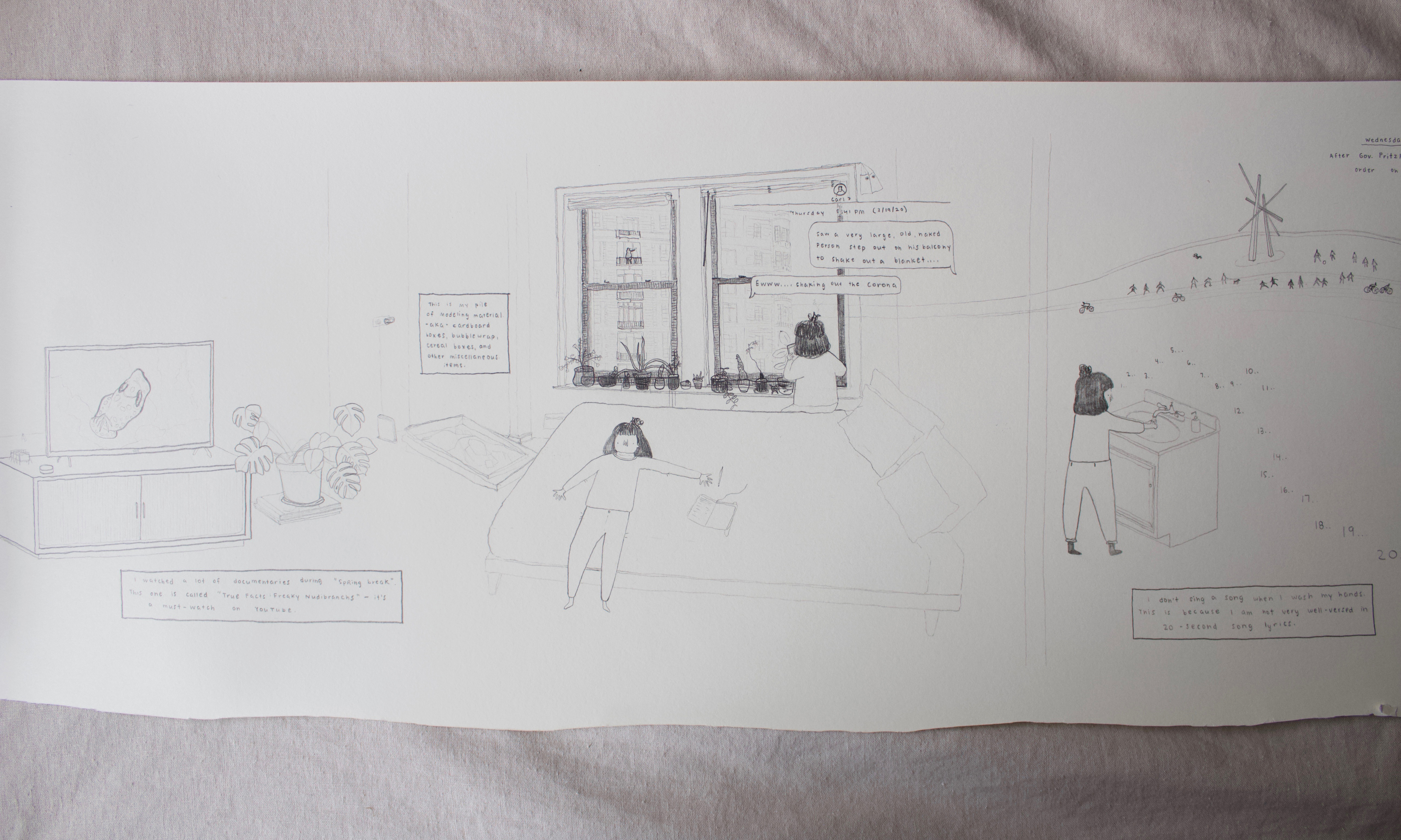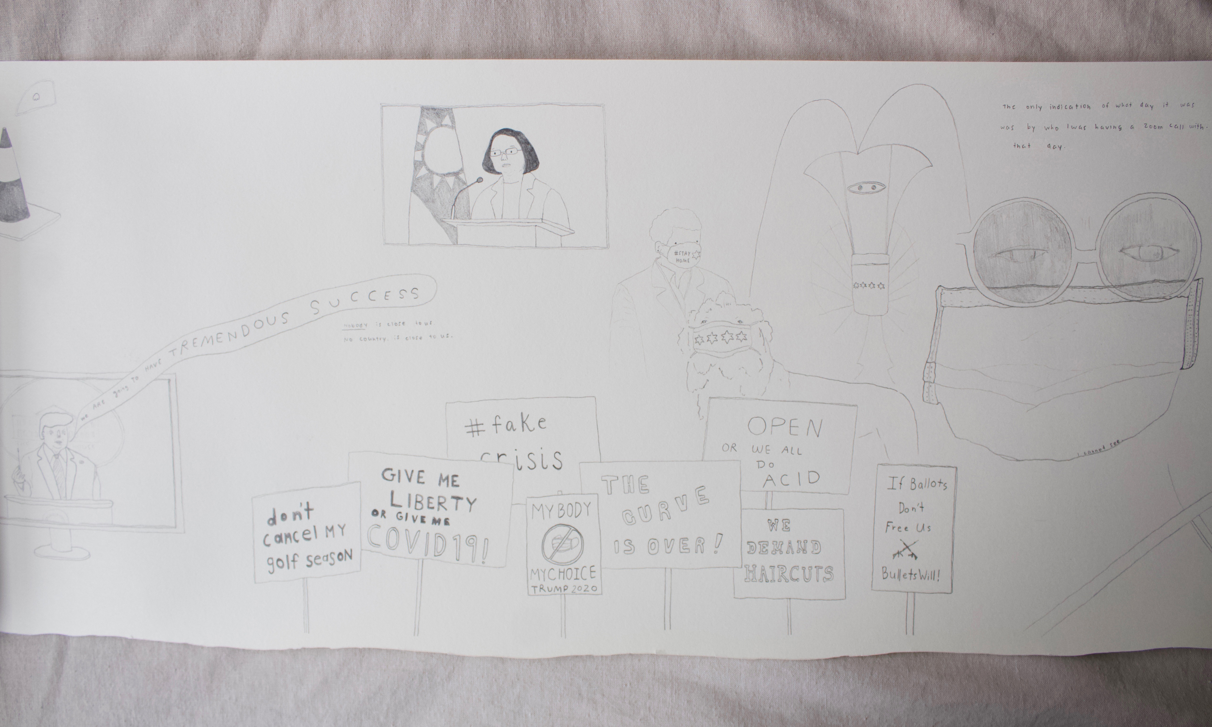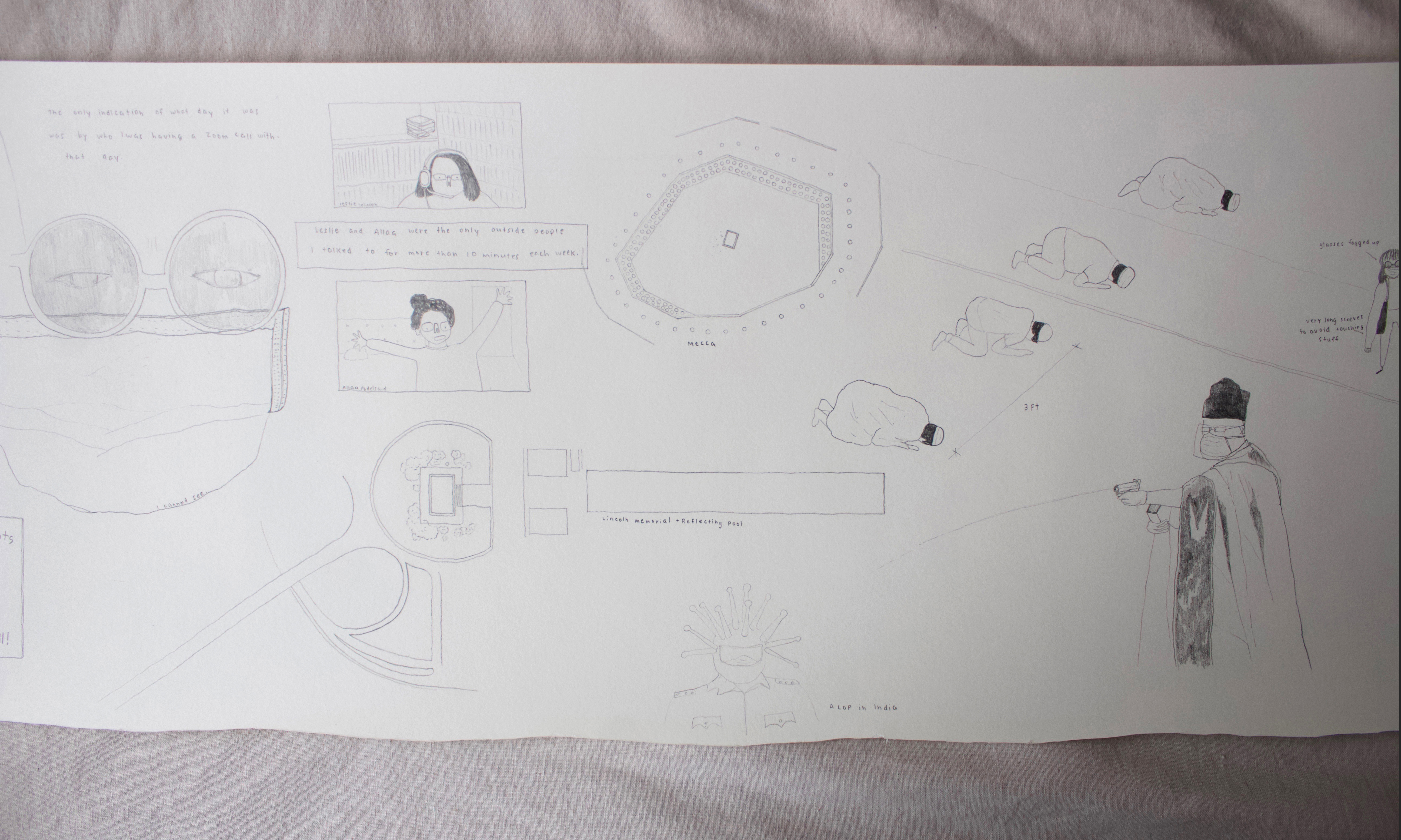 Started in lockdown, this thirty foot scroll illustrates the different ways the Covid-19 pandemic globally impacted the daily routines of life. With an emphasis on spatial organization, the two-year recording shares both anecdotal observations and news from online sources while in isolation.