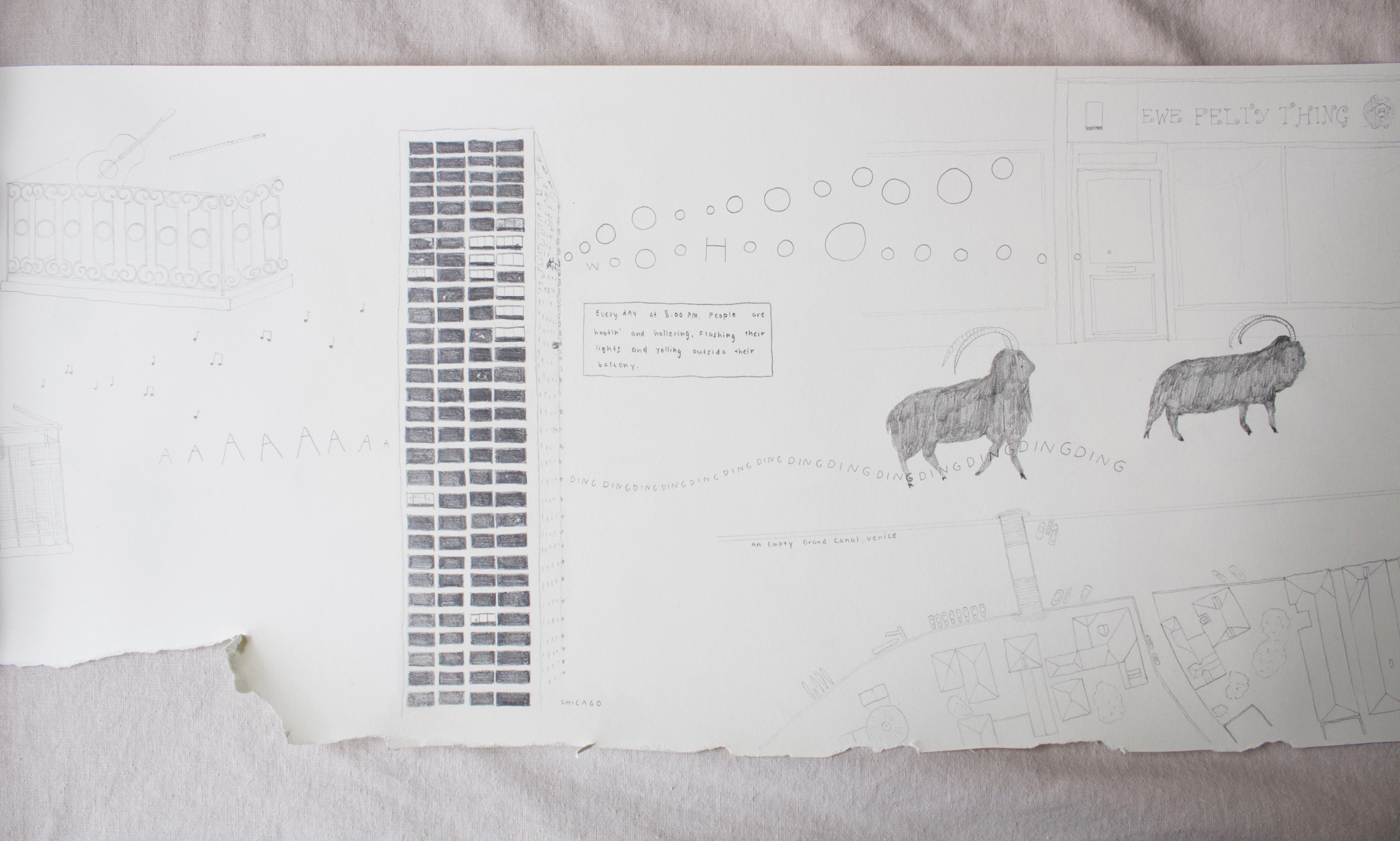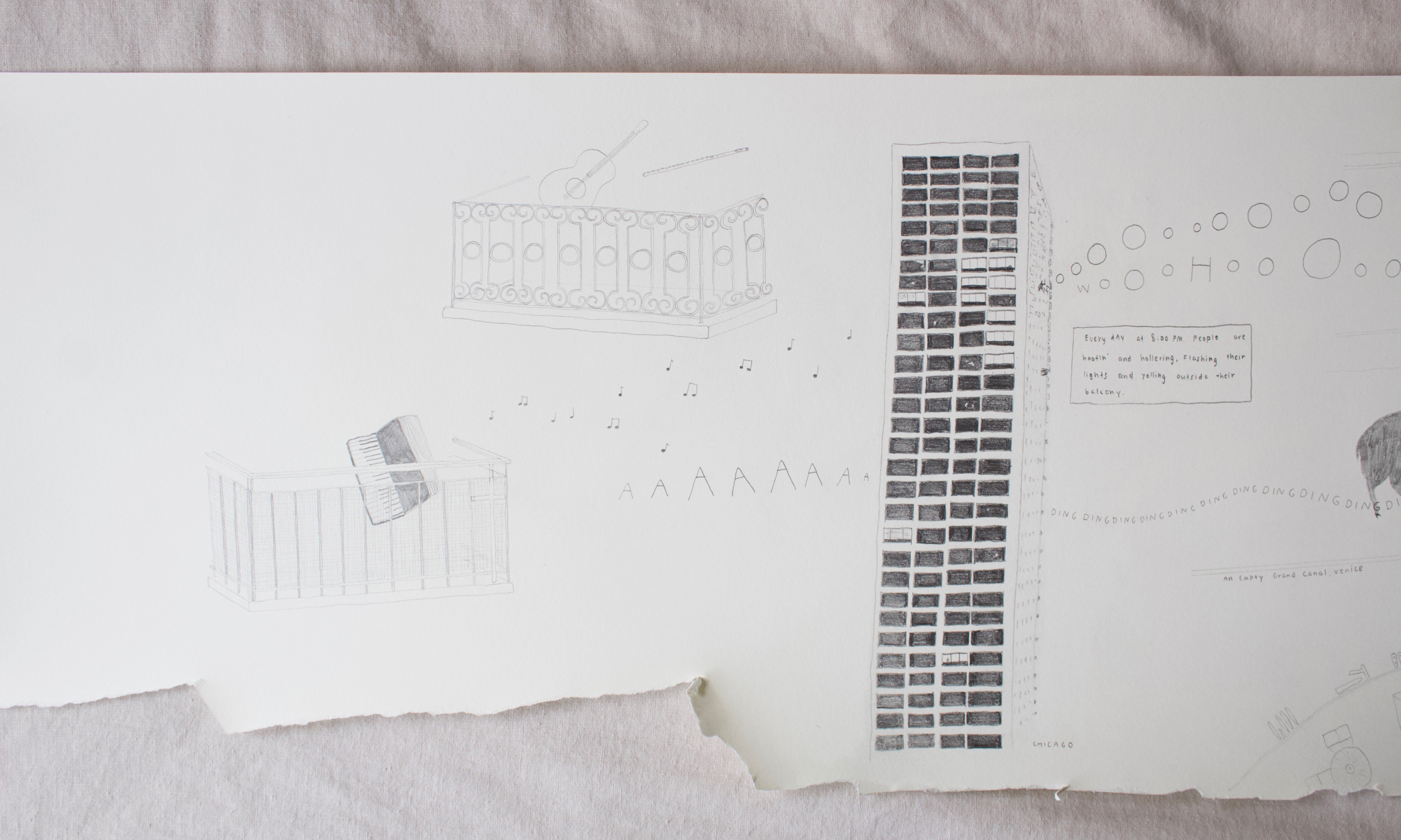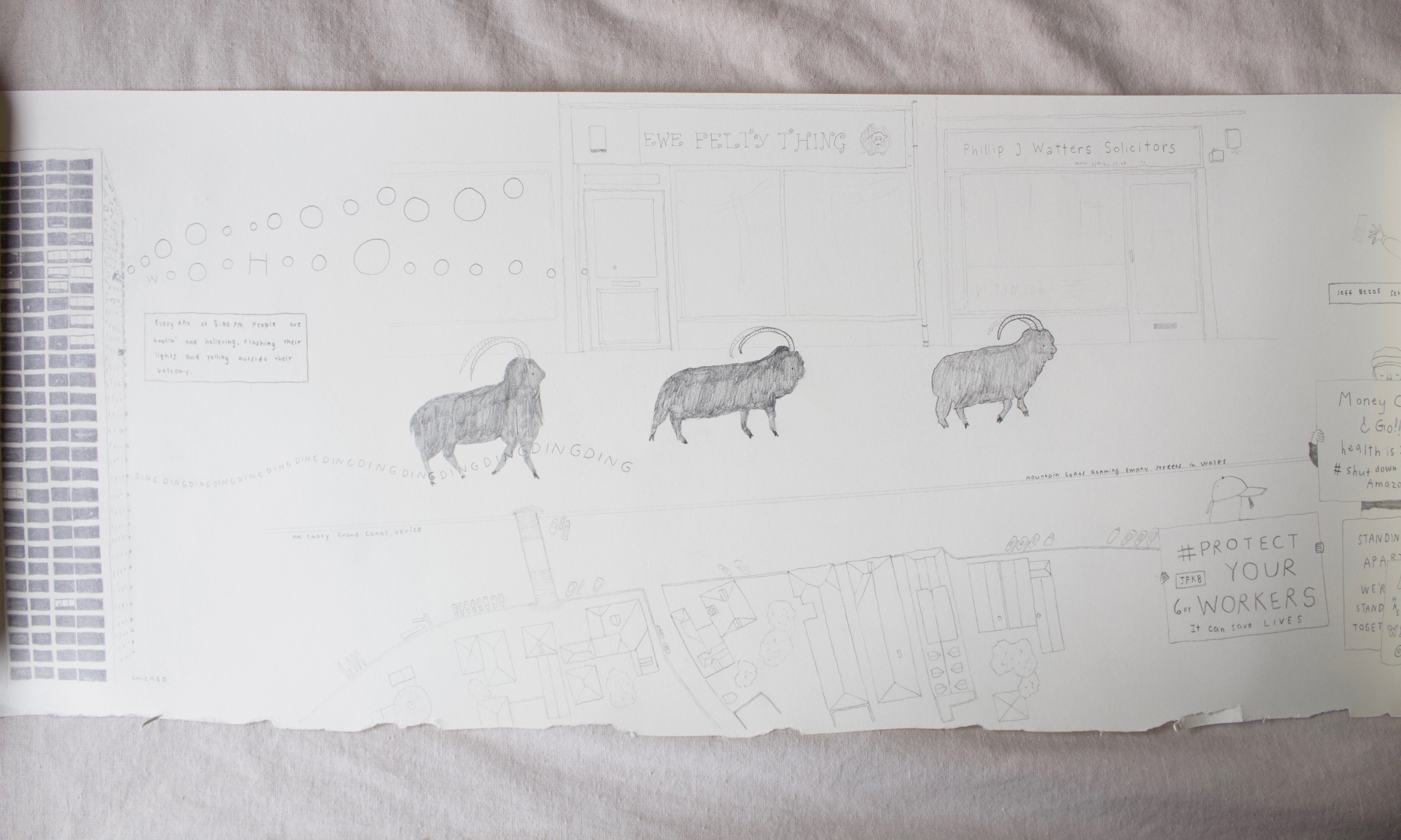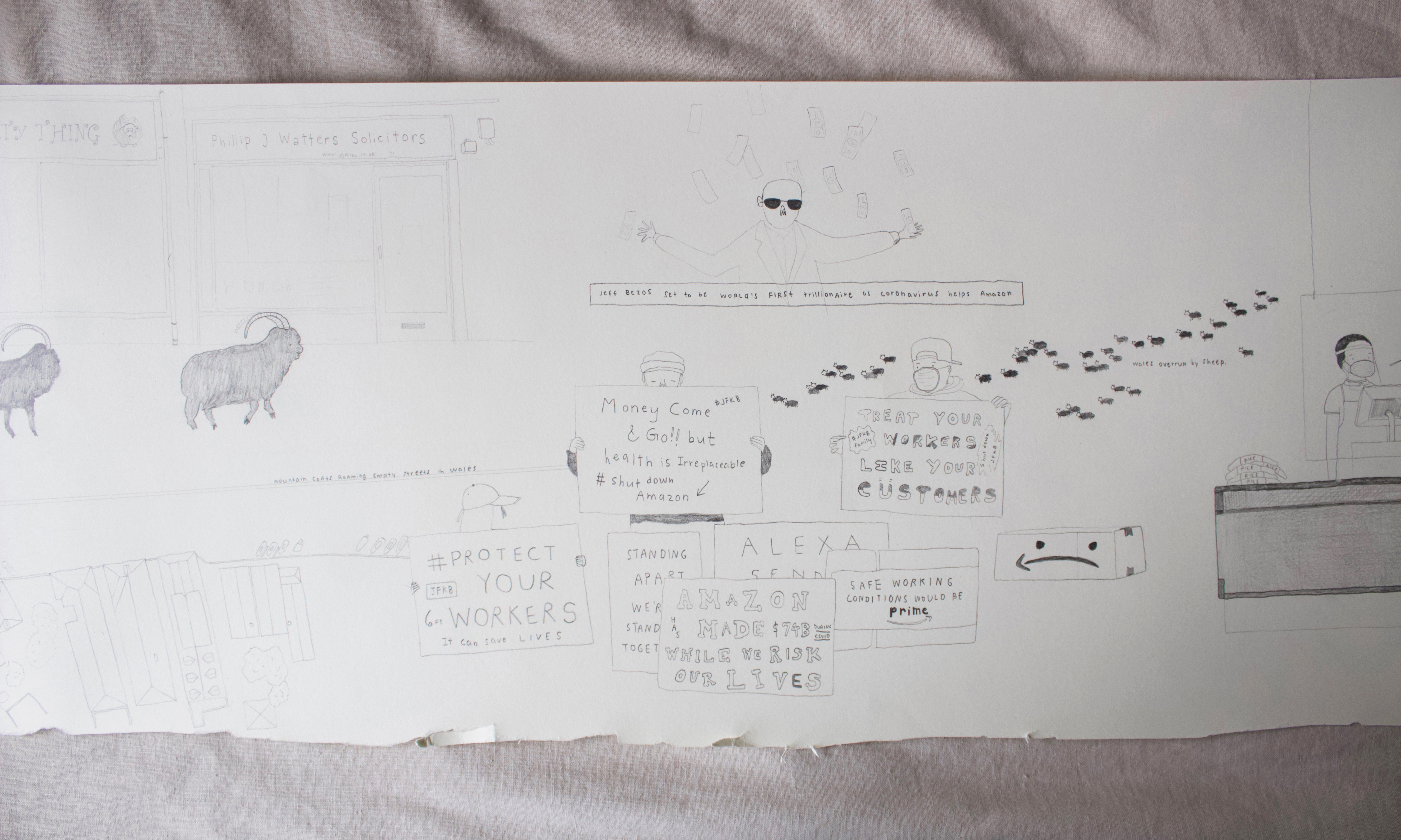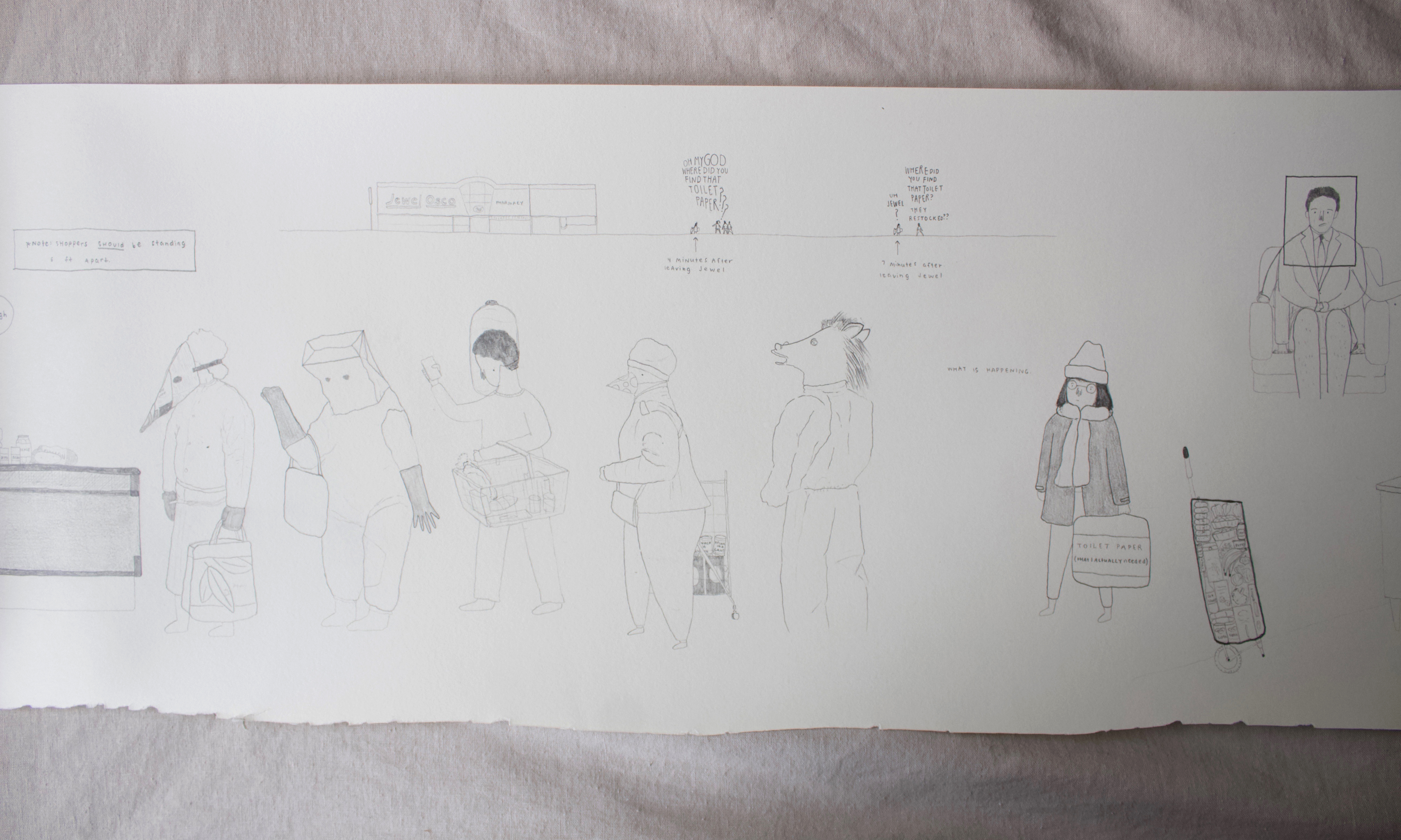Started in lockdown, this thirty foot scroll illustrates the different ways the Covid-19 pandemic globally impacted the daily routines of life. With an emphasis on spatial organization, the two-year recording shares both anecdotal observations and news from online sources while in isolation.