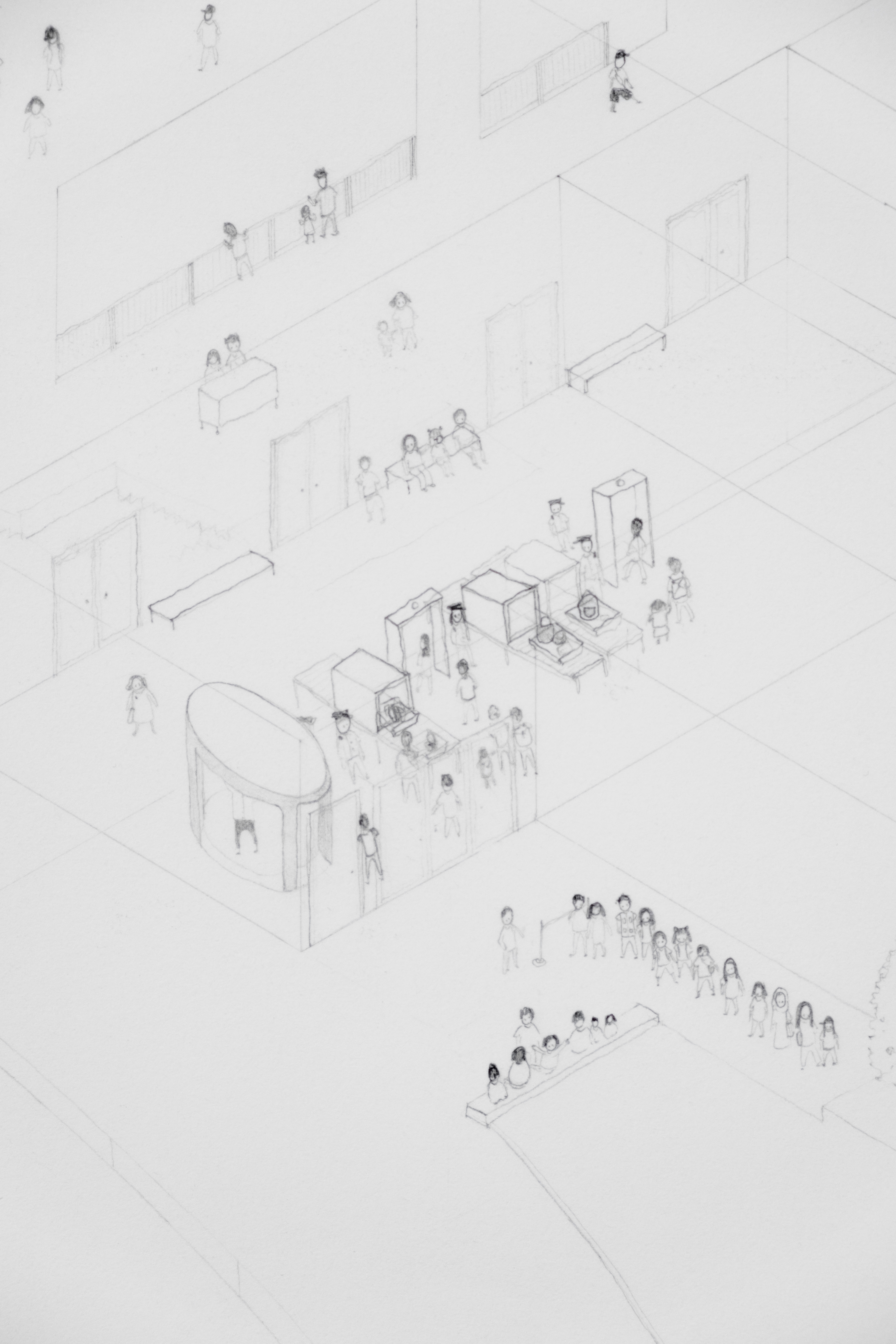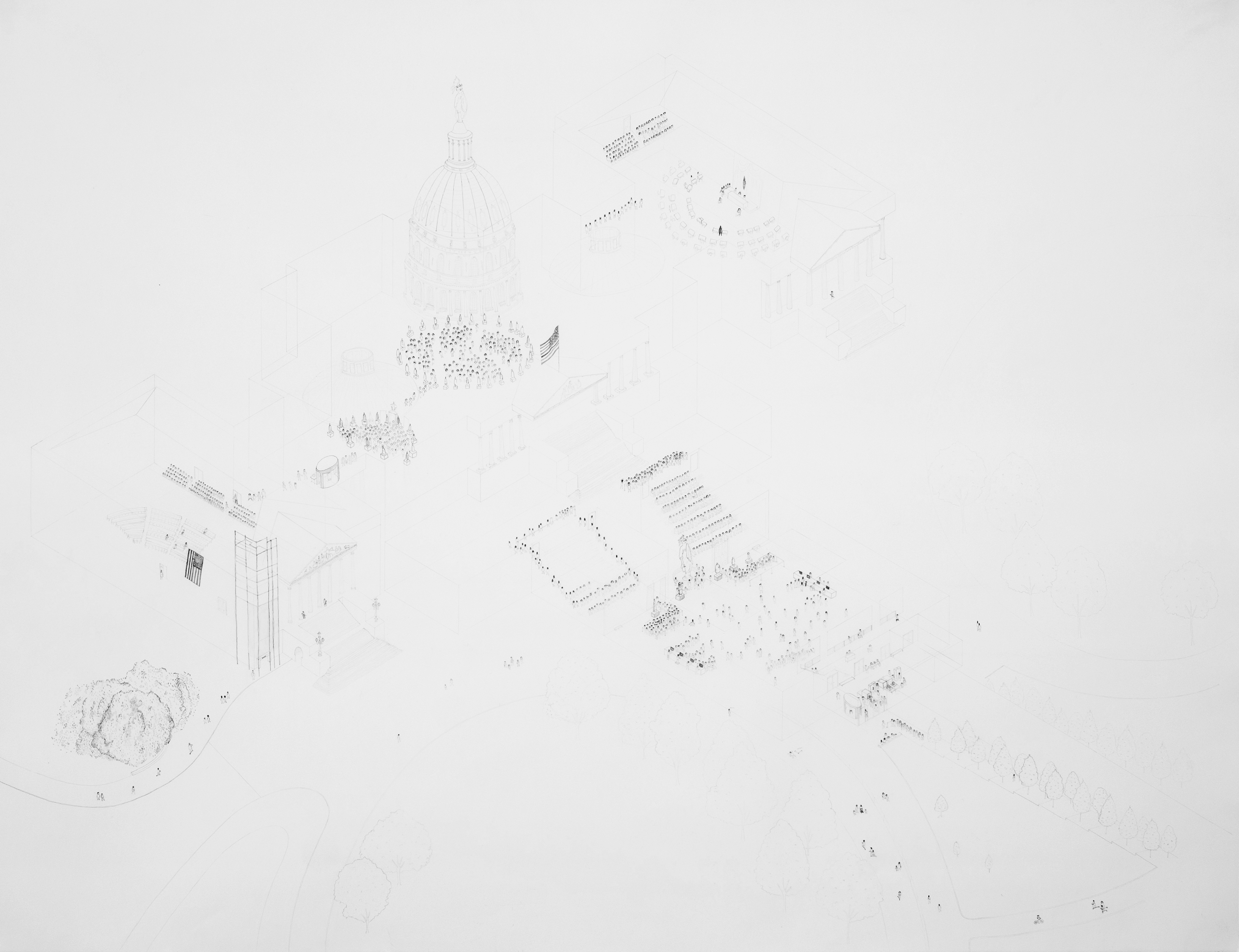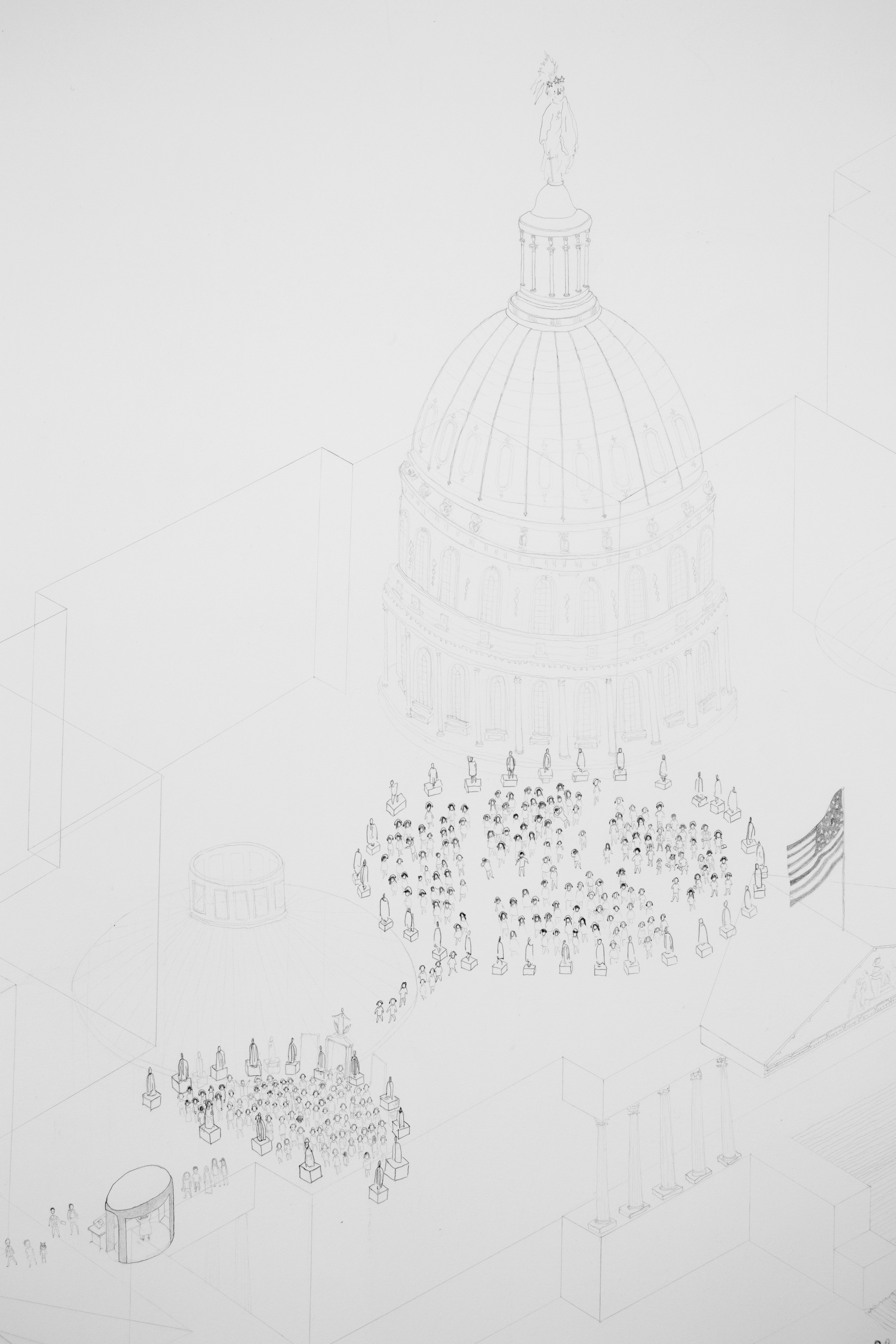 The drawing is an analysis of movement and grouping through space. It recalls a visit to the U.S. Capitol Building illustrating the complete sequence from the entrance to the House and Senate Chambers. Bodies become lines, waiting to be let through security. Devices like ropes, x-ray machines, stairs, and statues become way-finders as they direct and control the speed of movement. Round rooms create organic clusters, whereas rows of chairs create rigid uniform lines.